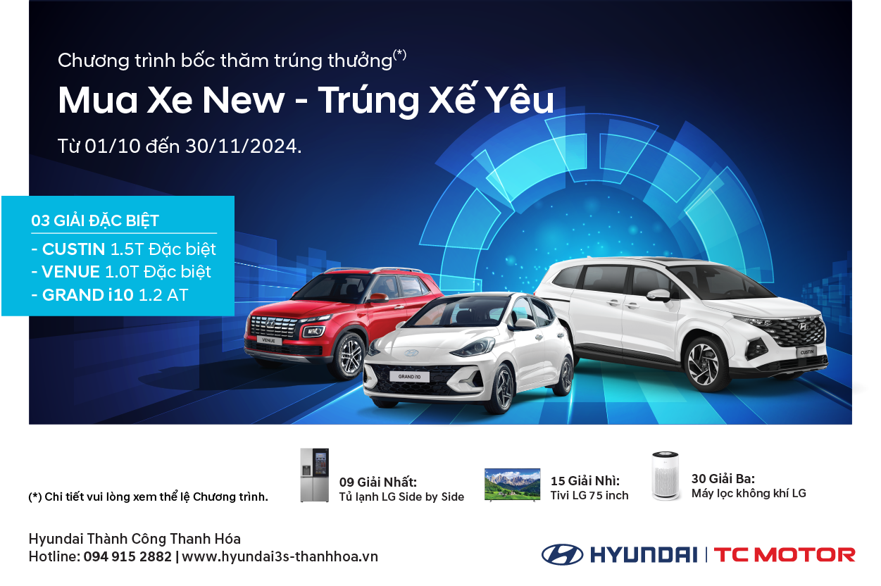 Thay lời tri ân đến Quý khách hàng thân thiết đã tin tưởng và lựa chọn sử dụng dịch vụ tại Hyundai Thanh Hóa trong thời gian qua. Hyundai Thanh Hóa triển khai tổ chức chương trình tri ân khách hàng ” MUA XE NEW – TRÚNG XẾ YÊU” dành cho tất cả khách hàng mua xe từ ngày 01/10/2024 – 30/11/2024