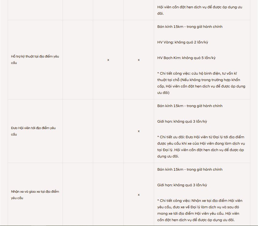 Lượt tích điểm dịch vụ của xe trong kỳ xét hạng (lượt)1 lượt hoặc Khách hàng mua xe mới34+ Hạng Tiêu chuẩn áp dụng lần đầu tiên khi đăng ký chương trình. Sau đó duy trì hoàn toàn.