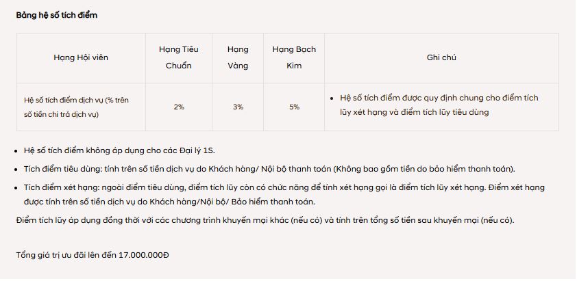 + Số tiền chi trả này được quy đổi thành điểm tích lũy xét hạng (theo tỷ lệ tích điểm dịch vụ) để tính toán phân hạng.