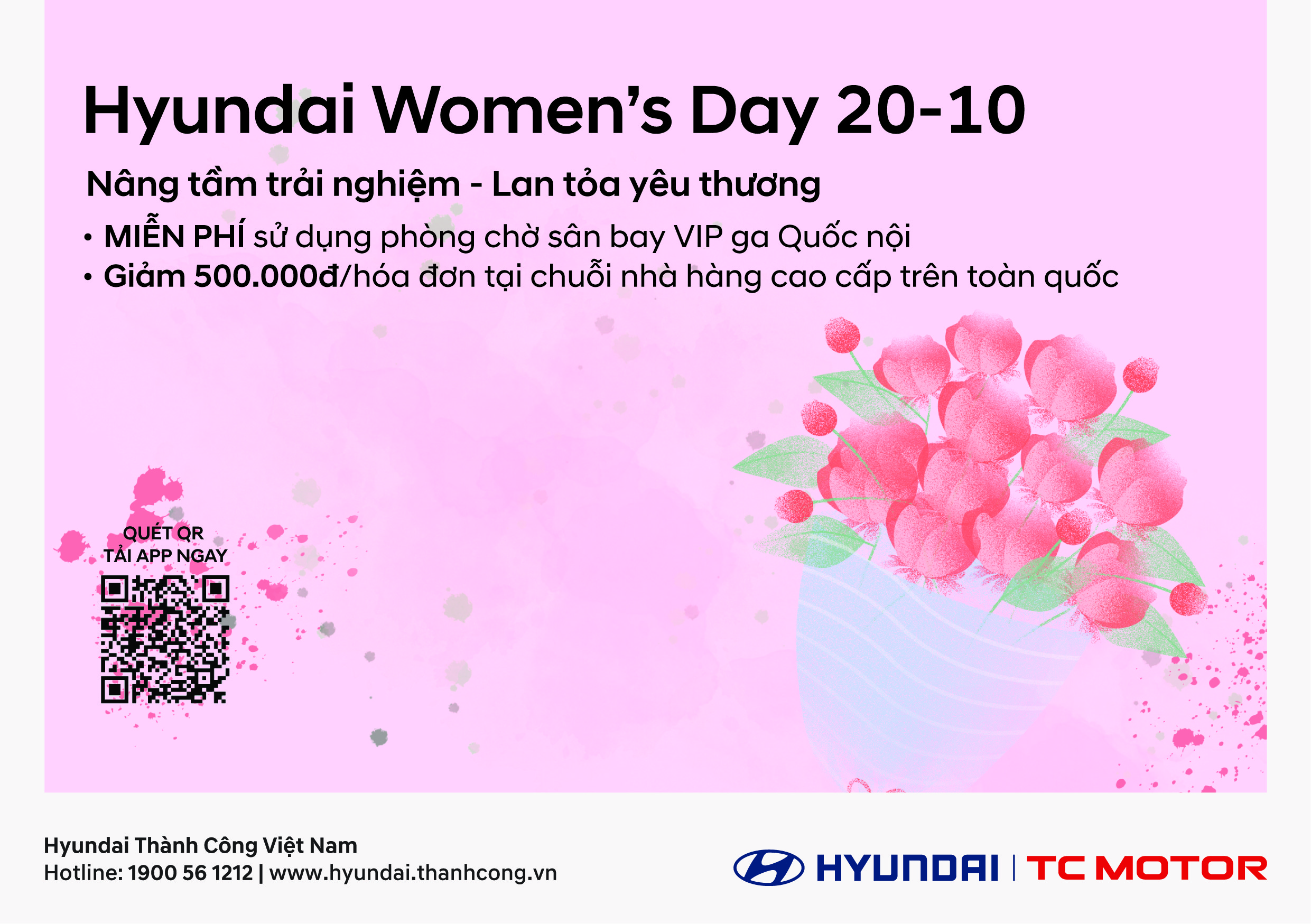 Tháng Mười – tháng của yêu thương, tháng để gửi lời tri ân đến những người phụ nữ tuyệt vời bên bạn. Hyundai trân trọng dành tặng Quý Hội viên chương trình ưu đãi đặc quyền, mang đến những khoảnh khắc trải nghiệm trọn vẹn và ý nghĩa dành cho bạn và người phụ nữ yêu thương.