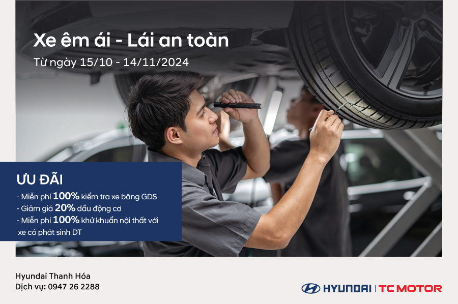 Chương trình khuyến mãi dịch vụ “Xe êm ái – Lái an toàn” chính thức khởi động từ ngày 15/10 đến hết ngày 14/11/2024. Chương trình dành cho tất cả các khách hàng đang sử dụng xe Hyundai ( 9 chỗ trở xuống và H100).