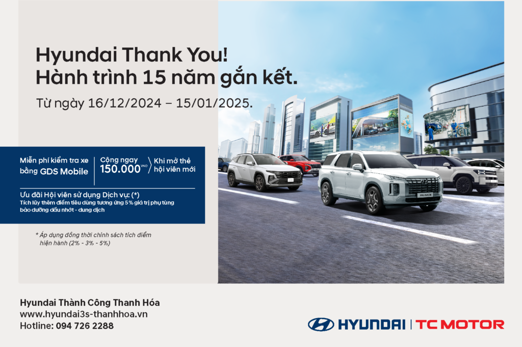Hyundai Thanh Hóa triển khai chương trình khuyến mại dịch vụ tri ân khách hàng cuối năm “Hyundai Thank You!”, đánh dấu hành trình 15 năm gắn kết, chính thức được khởi động từ ngày 16/12/2024 đến hết ngày 15/01/2025. Chương trình dành cho tất cả các khách hàng đang sử dụng xe Hyundai ( 9 chỗ trở xuống và H150).