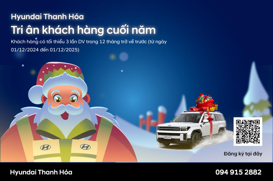 Đối tượng khách hàng: Khách hàng thân thiết của Hyundai Thanh Hóa có tổi thiểu 3 lượt dịch vụ trong 12 tháng trở về trước thời điểm diễn ra chương trình (từ 1/12/2024 đến 1/12/2025), lấy lượt dịch vụ từ cao xuống thấp và chưa đưởng hưởng tri ân lần nào.