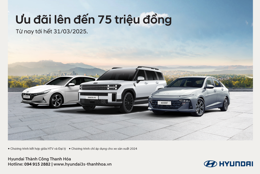 Tháng 3 Hyundai Thanh Hóa chính thức triển khai Chương trình ưu đãi hấp dẫn ưu đãi giảm giá trực tiếp lên đến 75 triệu đồng cho các dòng xe Hyundai có số VIN sản xuất năm 2024.