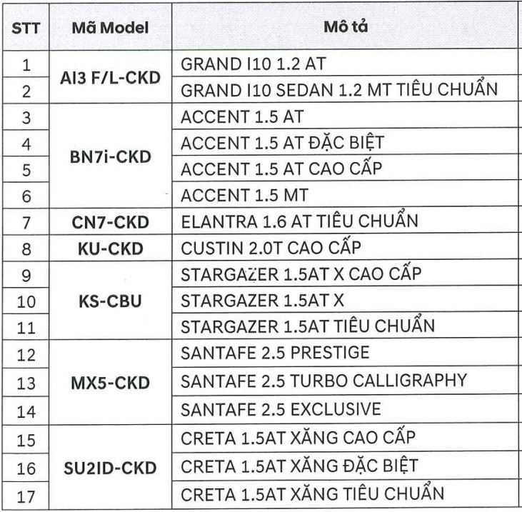 Danh sách các mẫu xe được hưởng ưu đãi: